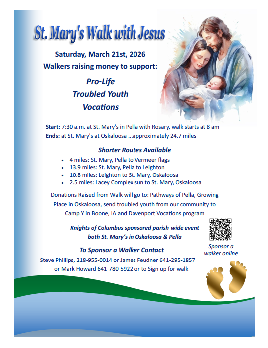 St. Mary’s Walk with Jesus is a fundraising walk that is co-sponsored by both St. Mary Pella and St. Mary Oskaloosa Knights of Columbus. It will take place on Saturday, March 21, 2026, beginning in Pella and ending in Oskaloosa—about 24.7 miles, with several shorter route options. Funds raised will support pro‑life efforts, troubled youth, and vocations. Participants can sign up or sponsor walkers through the listed contacts.